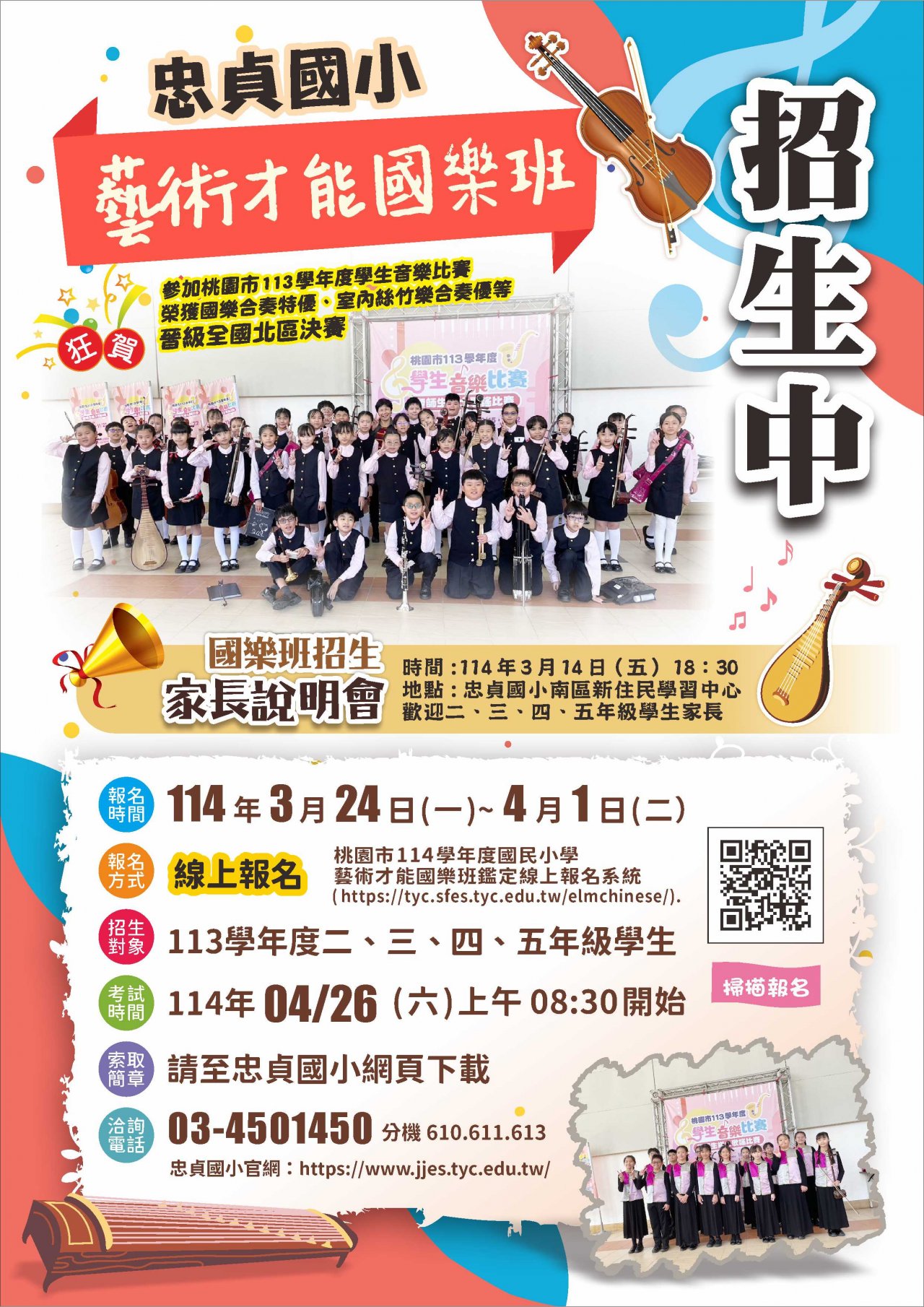 主旨:本校承辦「桃園市 114 學年度國民小學藝術才能國樂班鑑 定招生家長說明會」詳如說明,請 查照。 說明: 一、日期: 114 年 3 月 14 日(五)18 : 30 。 二、地點:忠貞國小中正大樓二樓禮堂。 三、報名方式:欲參加之家長自行填寫表單報名(網址: https://forms.gle/T97TVPwrSac9eJCm8)。 四、說明會當天汽機車可以進入校園內停車。 五、請貴校協助公告周知。