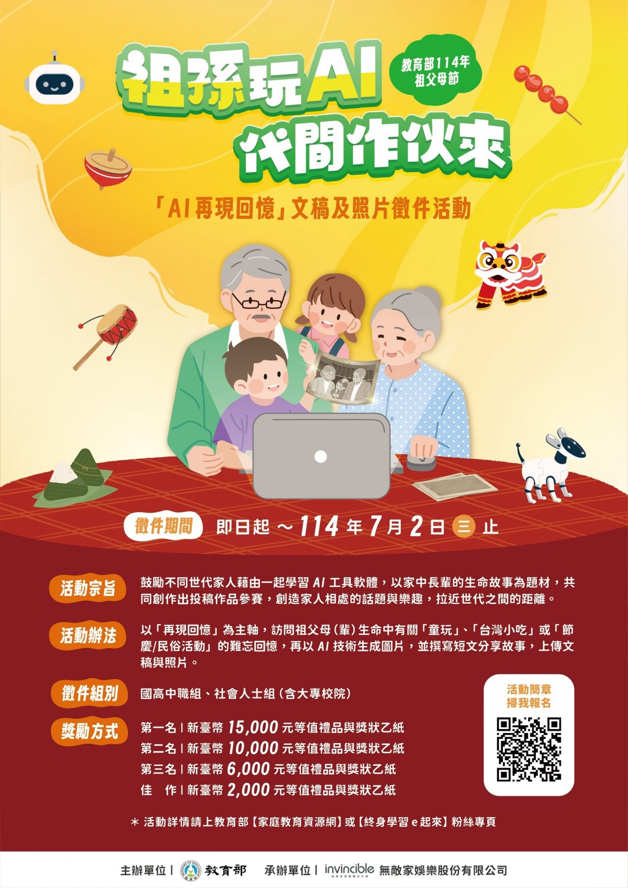 三、 旨揭徵件組別分為「國中高中職組」及「社會人士組(含大專校院)」,共 2 組。參賽者須與不同世代家人組隊,以「再現回憶」為主軸,訪問祖父母(輩)生命中有關「童玩」、「台灣小吃」或「節慶/民俗活動」的難忘回憶,再以 AI 技術生成圖片,並撰寫短文分享故事,上傳文稿與照片。